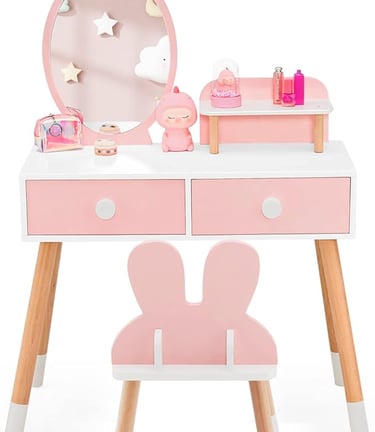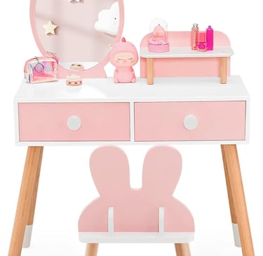 2-in-1 Kids Vanity Table and Chair Set, Wooden Children Make Up Table with Detachable Mirror, 2 Pull-out Drawers and Storage Shelf, Toddlers Dressing Table Set for Girls (Pink)