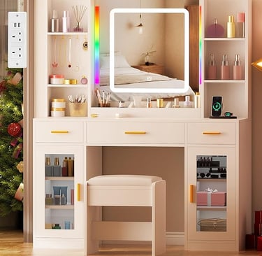 ANWBROAD Dressing Table, Vanity Desk with Mirror and LED Lights 3 Colors Large Vanity Table Set with Power Outlet 3 Drawers 9 Open Storage Areas Modern White Makeup Desk for Women Girl Bedroom