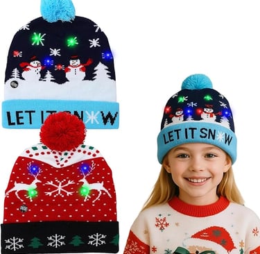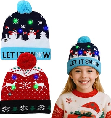 Falafoty 2PCS Christmas LED Light Up Hat, Novelty Xmas Beanie Knitted Hat, Unisex Winter Snow Hat's New Year Reindeer Snowmen Party Headhat for Kids Adult